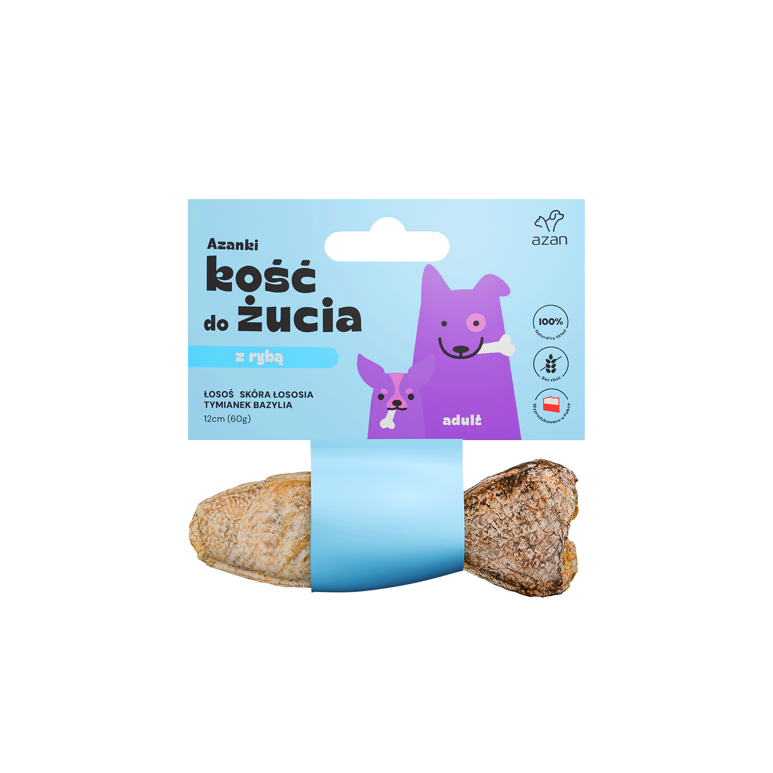 Azanki Kość do żucia ADULT z łososiem w skórze łososia z tymiankiem i bazylią to wyśmienity przysmak dla dorosłych psów ras małych i średnich, zaspokajający ich naturalną potrzebę gryzienia i żucia. Kości nie zawierają ostrych i kruchych elementów, stanowiąc bezpieczniejszą alternatywę dla rozmaitych gryzaków.