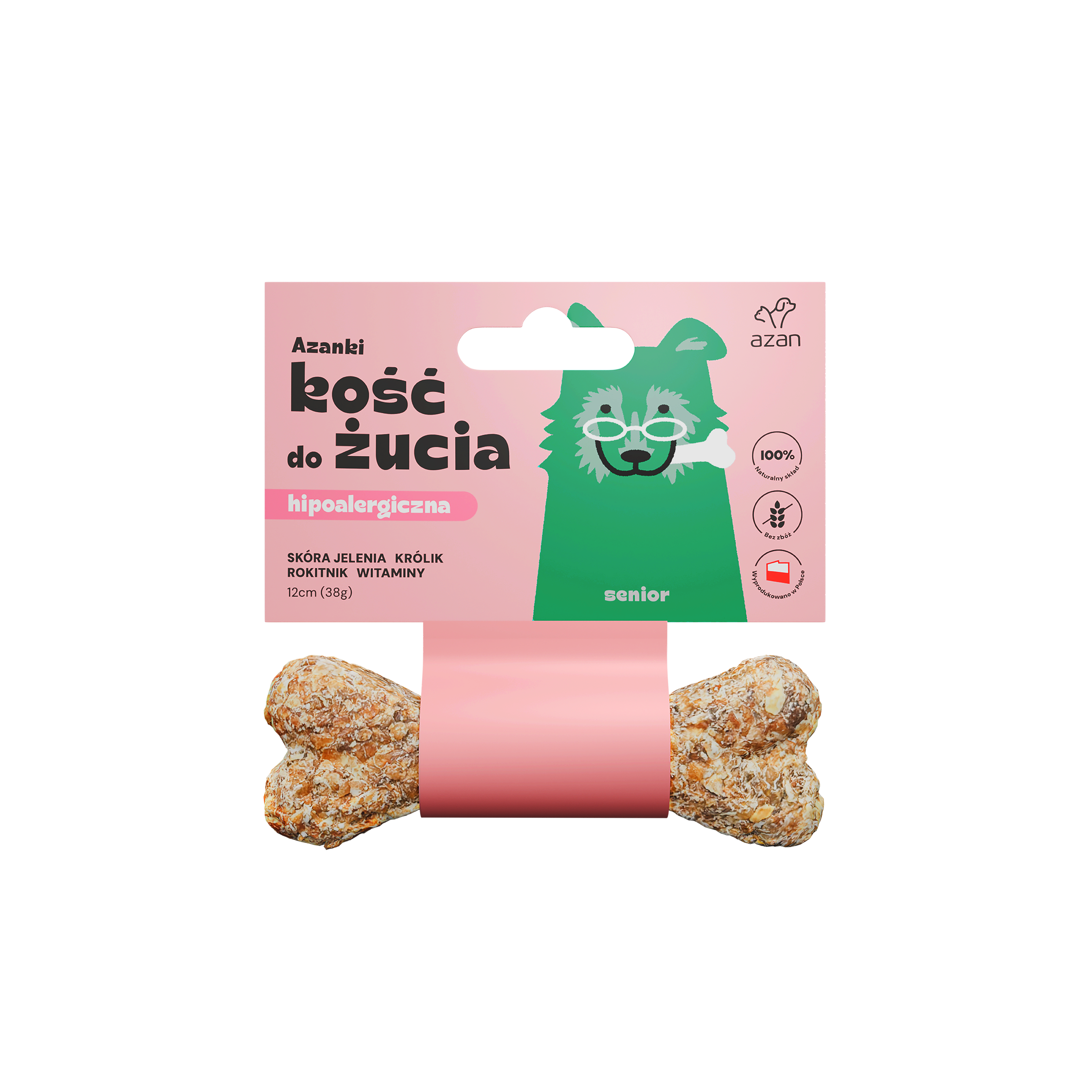Azanki Kość do żucia Senior ze skóry jelenia z królikiem, rokitnikiem i witaminami to wyśmienity przysmak dla starszych psów wszystkich ras, zaspokajający ich naturalną potrzebę gryzienia i żucia. Kości nie zawierają ostrych i kruchych elementów, stanowiąc bezpieczniejszą alternatywę dla rozmaitych gryzaków.