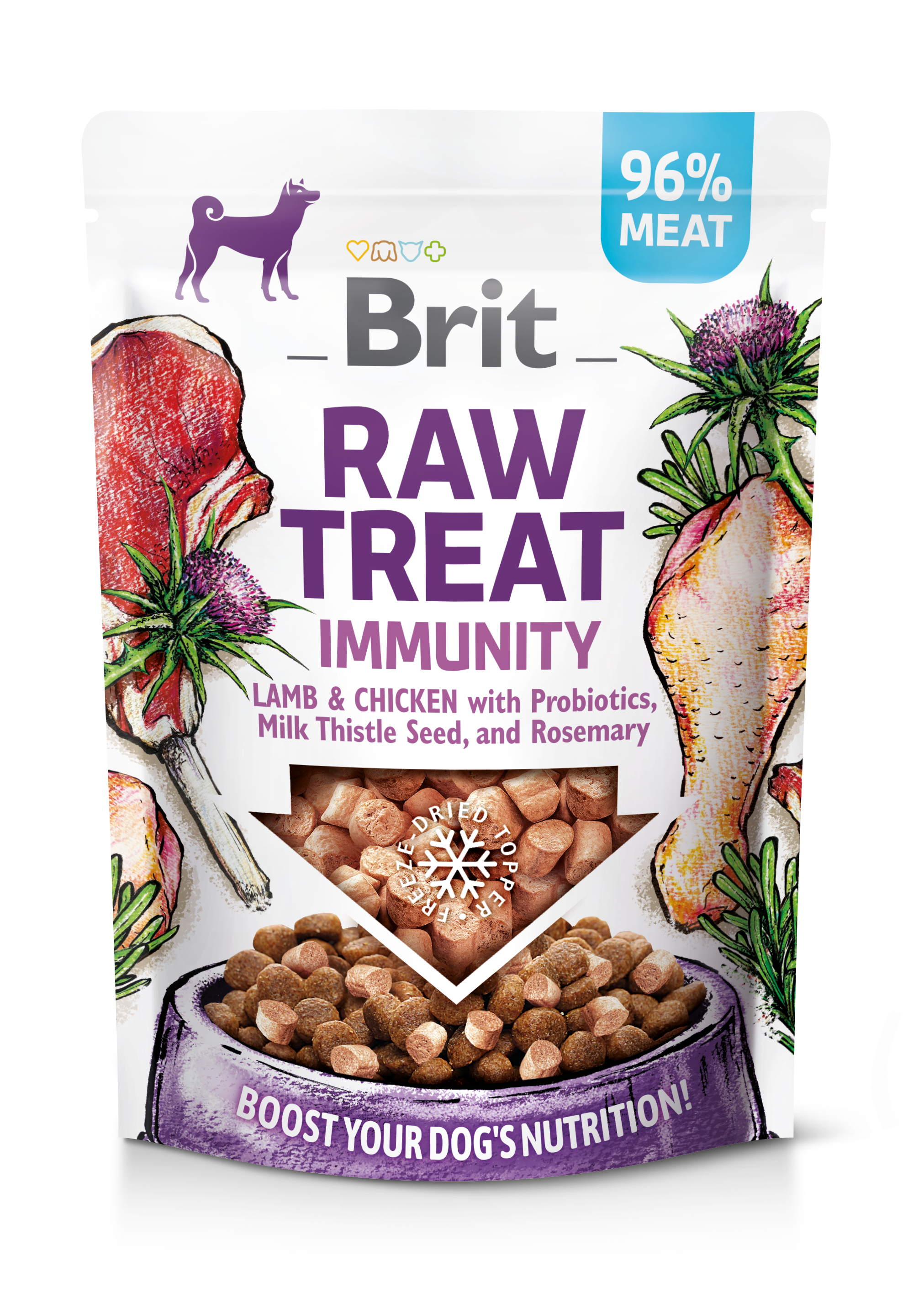 Brit Raw Treat Dog Immunity Lamb & Chicken with Probiotics, Milk Thistle Seed and Rosemary to wyśmienite, liofilizowane przekąski, które mogą służyć zarówno jako przysmaki treningowe, jak i toppery (“dosmaczacze”) poprawiające smakowitość karmy. Jagnięcina i kurczak zostały wzbogacone probiotykami, ostropestem plamistym i rozmarynem - wszystko w trosce o budowanie odporności organizmu psa. Proces liofilizacji sprawia, że smakołyki zachowują wartości odżywcze zbliżone do surowej żywności lub diety BARF, oferując przy tym potencjalne korzyści zdrowotne dla zwierząt domowych. Brit Raw Treat są lekkostrawne i wybitnie smakowite, przez co stanowią doskonałą opcję żywieniową dla psów z problemami trawiennymi, o wysokich wymaganiach lub gorszym apetycie spowodowanym naturalnymi procesami starzenia się organizmu.