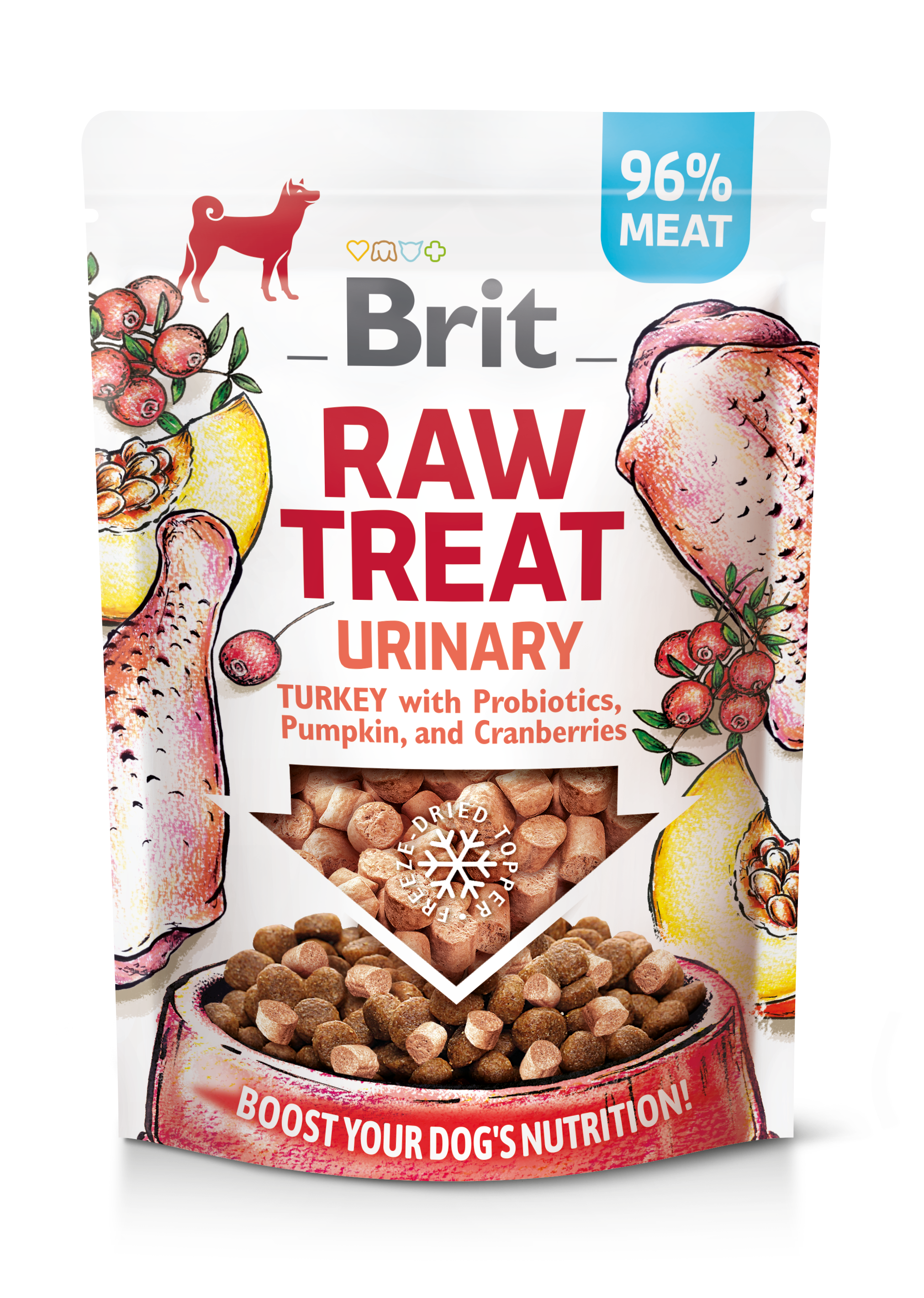 Brit Raw Treat Dog Urinary Turkey with Probiotics, Pumpkin and Cranberries to wyśmienite, liofilizowane przekąski, które mogą służyć zarówno jako przysmaki treningowe, jak i toppery (“dosmaczacze”) poprawiające smakowitość karmy. Indyk został wzbogacony probiotykami oraz dynią i żurawiną- wszystko w trosce o zdrowie dróg moczowych. Proces liofilizacji sprawia, że smakołyki zachowują wartości odżywcze zbliżone do surowej żywności lub diety BARF, oferując przy tym potencjalne korzyści zdrowotne dla zwierząt domowych. Brit Raw Treat są lekkostrawne i wybitnie smakowite, przez co stanowią doskonałą opcję żywieniową dla psów z problemami trawiennymi, o wysokich wymaganiach lub gorszym apetycie spowodowanym naturalnymi procesami starzenia się organizmu.