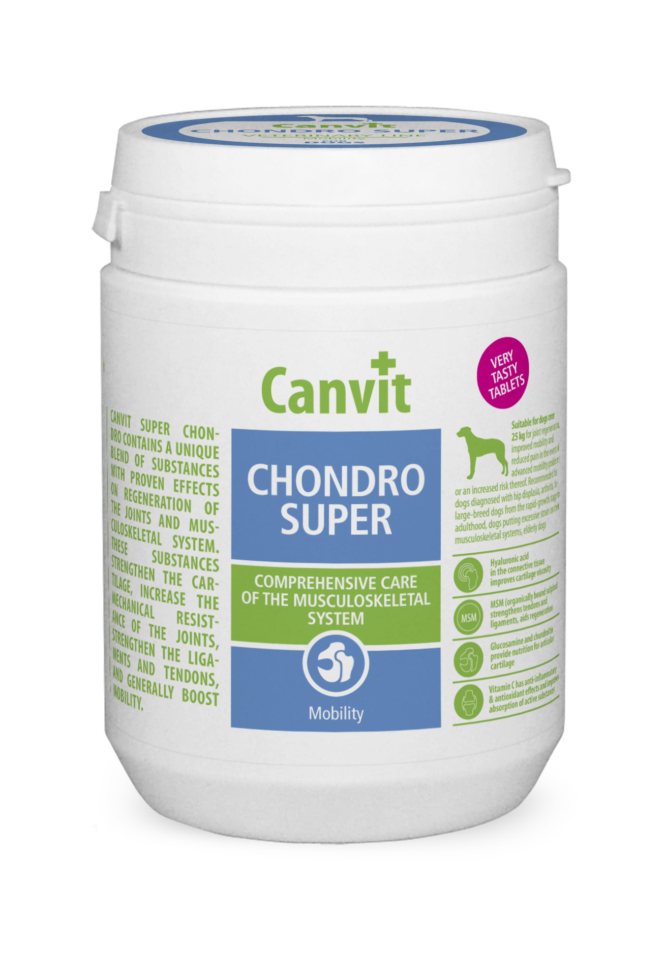 Preparat wzmacniający stawy o wyśmienitym smaku wątróbki! Canvit chondro super to unikalna mieszanka substancji o udowodnionym efekcie regeneracji stawów i układu mięśniowo- szkieletowego. Substancje te wzmacniają chrząstki stawowe, zwiększają wytrzymałość stawów, wytrzymałość ścięgien i więzadeł. Suplement diety dla psów zawierający siarczan glukozaminy, siarczan chondroityny, MSM (metylosulfonylometan), kwas hialuronowy i kwas askorbinowy.