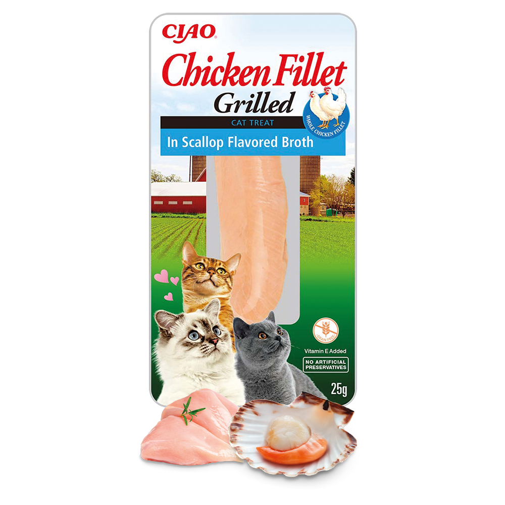 Uzupełniająca karma dla kotów. Grillowany filet z kurczaka w bulionie z przegrzebków.
