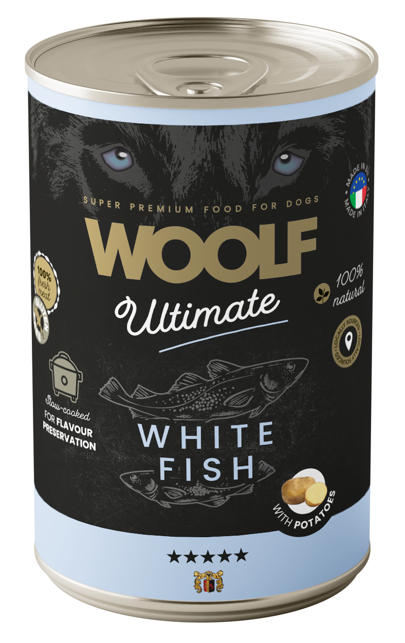 WOOLF Ultimate Dog Adult White Fish with potatoes to kompletna, bezglutenowa karma na bazie białej ryby z ziemniakami stworzona z myślą o dorosłych psach wszystkich ras. Receptura zawiera ograniczoną liczbę składników, pochodzących od lokalnych dostawców. Wszystkie składniki są poddane procesowi wolnego gotowania w niższej temperaturze dla zachowania wartości odżywczych oraz doskonałej smakowitości. Ryby dostarczają dużej ilości niezbędnych kwasów tłuszczowych, natomiast ziemniaki są źródłem potasu, witamin i ważnych minerałów.